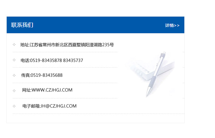 地址:常州市新北區友邦商務大廈1幢16、17層  電話:0519-85101652  傳真:0519-85112595  郵編:213022  網址:www.cz-jiayue_cn.szhongyue.com  郵箱:xiajifengaa@163.com